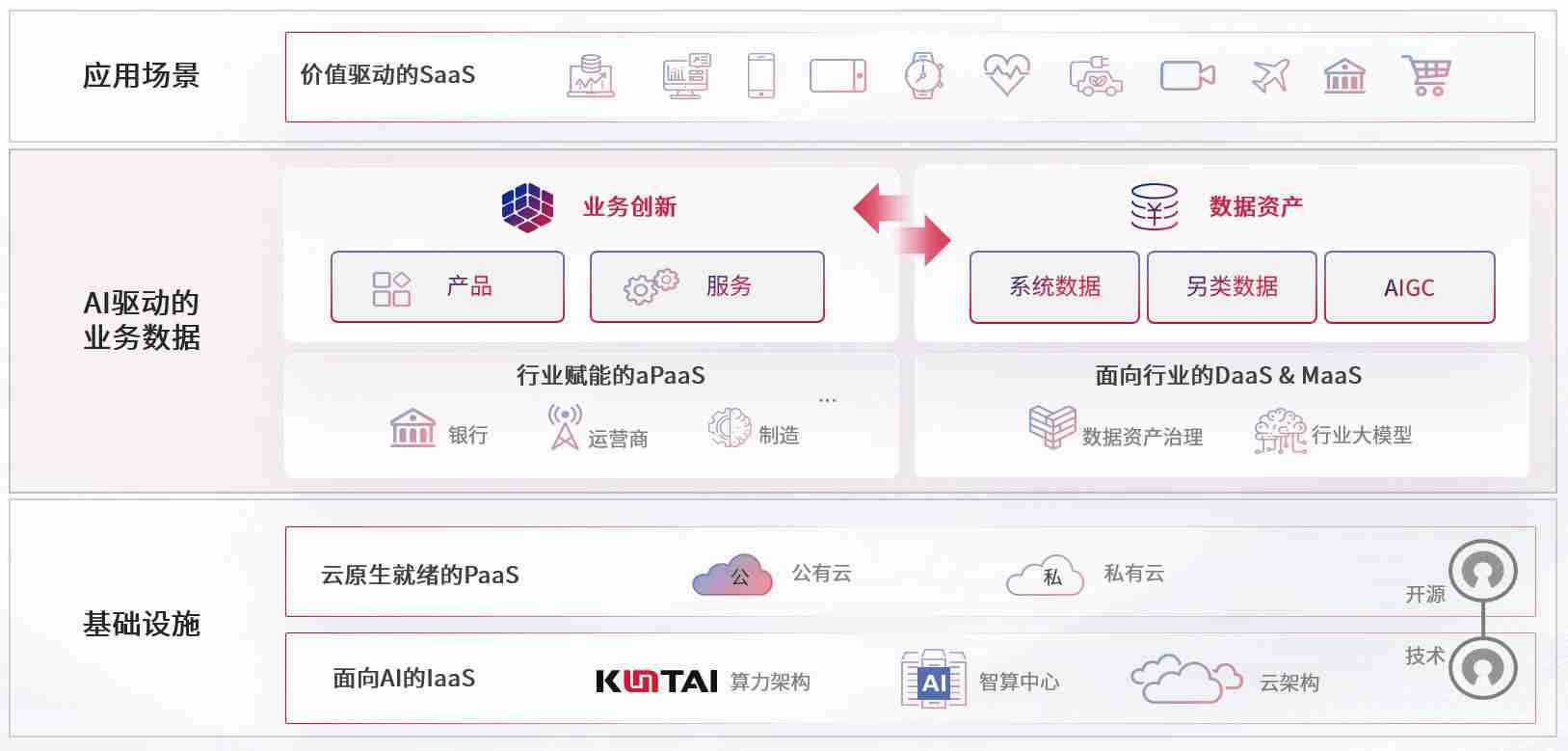 数字时代,,,围绕企业数字化转型的关键要素,,,,GGPOKER数码开创性的提出数云融合战略和技术体系框架,,,着力在云原生、、、数字原生、、AI原生和信创产业上架构产品和服务能力,,,,为处在不同数字化转型阶段的快消零售、、、汽车、、、金融、、、医疗、、、、政企、、教育、、、运营商等行业客户提供泛在的敏捷IT能力和融合的数据驱动能力,,,构建跨界融合创新的数字业务场景和新业务模式,,助力企业级客户建立面向未来的核心能力和竞争优势,,,全面推动社会的数字化、、、智能化转型升级。。